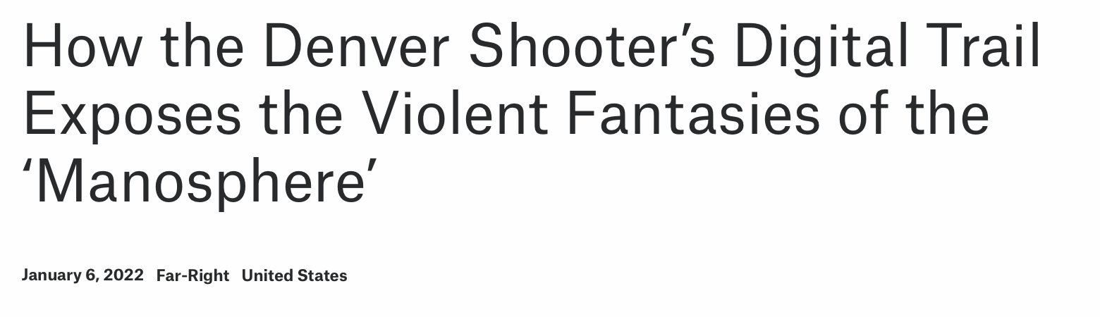 New article out in Bellingcat alexanderreidrossJanuary 6, 2022Uncategorized Post navigation PreviousNext My latest article with Shane Burley is a deep dive into the life and mind of the Denver shooter. https://www.bellingcat.com/news/americas/2022/01/06/how-the-denver-shooters-digital-trail-exposes-the-violent-fantasies-of-the-manosphere/ Share this: Share on X (Opens in new window) X Share on Facebook (Opens in new window) Facebook Like Loading... Related